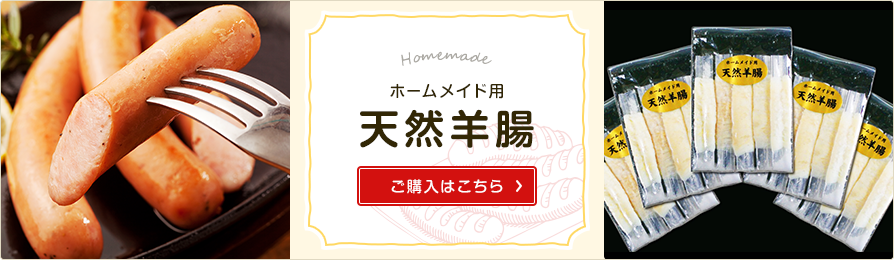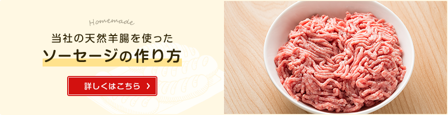 ソーセージで使用している皮は、羊の小腸を使っております。ボイルしたソーセージを噛んだときの「パリっ」とした食感が天然羊腸なのです。人工ケーシング(羊腸の代わりとなる人工で作った素材)で、詰めたソーセージもありますが、天然ならではの食感が味わえます。ニュージーランド、オーストラリア、中国などの羊が多くいる国が主な産地となります。